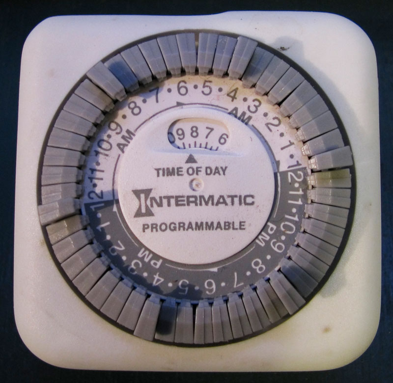 Another important piece of the puzzle is the light timer. When the fry are small, they don't need to be spending all their energy swimming against the current. This is why many breeders use only a sponge filter with the air turned down as far as possible to keep the water calm. But since I strongly believe in bio-wheels, I needed a way to use it while still letting the fry get some rest. To do that, find a mechanical or digital light timer that lets you do at least 6 on-off cycles and set it to run for 30 minutes every 4 hours. That's exactly 6 times a day. The bio-wheel can probably go 24 hours before the bacteria start to go into hibernation mode, so this will give you 3 hours of bio-wheel activity a day while keeping the wheel at least moist. As the fry get big enough to stand up to the current, you can disable the timer and let the filter run continuously.
